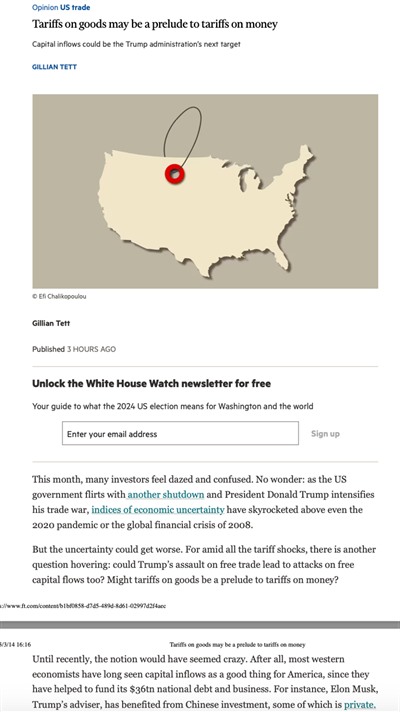 在初次分配中增加劳动者收入,在再分配中改善劳动者收入,是我们扩大内需应对特朗普关税战需要做的两件大事。但最近迹象表明,特朗普关税战遇到了挫折,因为很多重要产品的供应链都在美国之外(例如,苹果手机的配件很多在中国生产),特朗普关税的自伤程度相当大。他正在对包括中国出口在内的一些产品进行关税豁免。不过,我们需要注意的是,在关税战之后是金融战,特朗普很可能对流入美国的资本征税。最早报道这一可能性的是英国“金融时报”2025年3月14日的Gillian Tett的文章:
