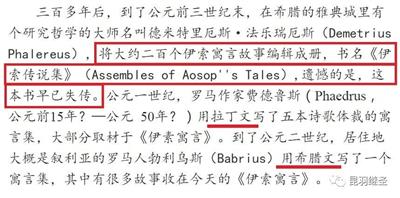 又过了百来年,叙利亚的罗马人勃利乌斯用希腊文写了一本寓言集,其中很多故事收在今天所见的《伊索寓言》中。为此,还亮出了所谓的“证据”。