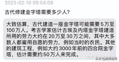 ChatGPT回答:大致估算,古代建造一座金字塔可能需要5万到100万人。考古学家估计,古埃及内塔金字塔建造所需劳动力是20多万人。3000年前的四合院金字塔,需要50万人完成。
