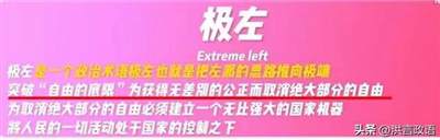 目前,网络上炒作的主要是“极左”的问题。因此,我们就应该搞清楚究竟什么是“极左”。关于“极左”,它是一个政治术语。查找了相关资料的解释是:极左,简单地说,就是过高地估计自己,过低地评价困难和敌人。极左也就是把左派的思想推向极端,突破“自由的底限”,为获得无差别的公正而取消绝大部分的自由,为取消绝大部分的自由必须建立一个无比强大的国家机器,将人民的一切活动处于国家的控制之下。