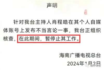 海南电视台主持人肖程皓因评议日本地震的“言论不当”遇到了麻烦。他在元旦当天,在个人抖音号上,发布了个人观点,大意是日本在开年第一天就发生如此之大的天灾,恐怕2024年整个日本都会笼罩在一层阴郁的乌云之下。有些事还是少做,核污水也不该排海。并在公屏上打出带问号的:报应来了?