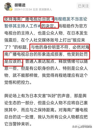 这还不算,网络大v@胡锡进老师出来讲话,坚定支持海南广电的决定,理由是,肖程皓是公众人物,不能讲与“他身份不相符”的话;还有“语境”不同,日本核污水刚排海时,可以讲“报应”,现在过去好几个月了,再讲“报应”就不妥了
