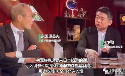 有的反向比推,日本核污水排海,中国停止进口日本水产品后,日本2名政客东国原英夫(日本前宫崎县知事)和桥下彻(日本前大阪府知事),在接受电视采访时说,中国游客到日本,每个人要吃够10个扇贝才可以入境,还要直播他们狼吞虎咽“说好吃的样子。还有强迫中国人到福岛给日本表演跳水。