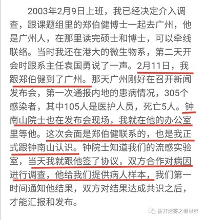 这时候,香港的SARS也爆发了,香港大学有了本地的病人标本,佩里斯在3月18日找到了非典病毒。管轶提出论文应该把钟南山也加进去,但系主任袁国勇不同意,因为病毒是用香港病人的标本分离出来的。