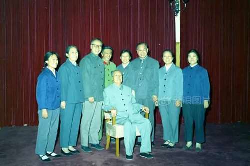 毛泽东晚年疾病很多,他还患有老年性白内障,眼睛非常怕光。1975年春天,毛泽东的眼睛基本失明。中央决定由北京中医研究院的大夫唐由之为毛泽东做手术。左眼手术取得成功,毛泽东又可以继续读书了。图为毛泽东与唐由之(左三)等医护人员合影。