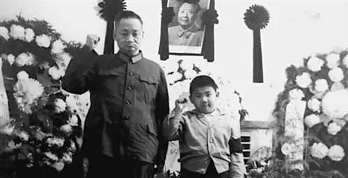 1976年9月9日:毛岸青与毛新宇在西山家中为毛主席设的灵堂前守灵。