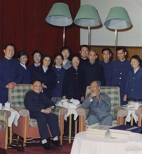 1973年,毛泽东再次启用邓小平。1975年,毛泽东亲自点将由邓小平出任国务院第一副总理、军委副主席兼总参谋长。图为1975年,毛泽东与邓小平以及毛泽东身边工作人员在中南海书房里一同合影。
