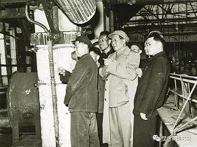 【1958年毛主席在重庆钢铁公司大型轧钢车间考察。】