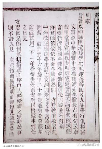 见,奉旨著以知县用。琉球学生毛邦俊等四名(另三人为向邦正、梁文翼、杨德昌),人品学行,俱彬彬文质,似中华儒雅。中堂费筠浦先生(1739—1811,讳淳,字筠浦,浙江钱塘人,时任体仁阁大学士,正一品)赠长古,有句云:‘卓哉雨堂真赏识,保奏明经褒嘉德;旋主讲席教琉球,懿言嘉行流外国。’毛邦俊等将承贡使回国,临行拜别府君,师弟依依不舍,各赋诗为别。府君著有《教习记》一卷、《改正琉球学生诗、古文、词》四卷。……”