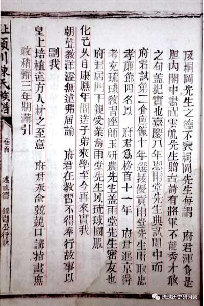 行状,是属于丧葬文化的一种应用文体。通常由死者子孙、门生故吏、亲朋好友撰述,叙述死者籍贯、世系、生卒年月、生平事迹,留作撰写墓志或提供给史官立传作为依据。这篇行状是陈锦湖去世后,其与清末大臣沈葆桢同科中举的儿子陈叙畴率兄弟四人“仝泣血稽颡谨状”、太子太保兵部尚书玉麟填讳的,篇名为《皇清敕授文林郎、例晋封奉直大夫、显考锦湖府君行状》,里头有一大段文字记叙了陈锦湖在京城国子监当琉球教习的经历,笔者对其中涉及到的时间、人物稍作注解,加以断句,谱文照搬如下:“……嘉庆八年(1803),恩雨堂先生(讳普,字雨堂,蒙古镶蓝旗人,时任福建学政)典试闽中,而府君(对已故父亲的尊称,下同)试第二,食廪饩;十年(1805)选拔优贡,雨堂先生所取‘忠、孝、廉、节’四名,以府君为榜首。十一年(1806),府君进京,得考充琉球教习,座师玉研农先生(1766—1833,讳麟,字子振,号研农,满族正黄旗人,时任吏部左侍郎,正二品),盖雨堂先生密友也。府君居门下,亲受业焉。雨堂先生以琉球国服化已久,自康熙年间送子弟来学,至今再来,实我朝声教洋溢,无违弗届。谕府君在教习,不得奉行故事,以副我皇上培植远方人材之至意。府君承命兢兢,口讲指画,无敢稍懈。三年期满,引