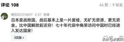 刚从网络上看到一个网民在对一个网友文章发表的评论,那个网友的文章大意是不能说前30年都吃不饱。然而一位来自新疆的网民发了这样一条评论,他的评论是这样说的:“日本是战败国,战后基本上是一片废墟,无矿无资源,更无资金,比中国解放前还穷!七十年代田中角荣访问中国时已经进入发达国家!”看了这段话,不能不说两句,以澄清一下历史。虽然只是一个只有几十个粉丝的网民,但他的这种言论有着一定的代表性。他的意思日本重建时比中国基础还差,但到70年代时日本已经进入发达国家,言下之意,中国还很“穷”。他虽然没有这样说,但他是驳斥那个网友的观点,就已经表明他的这个观点。