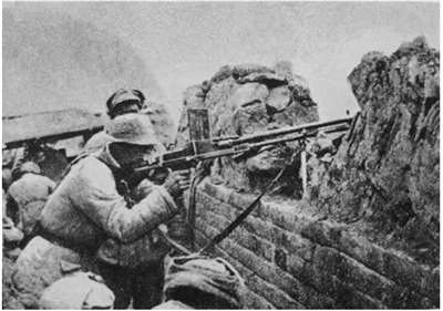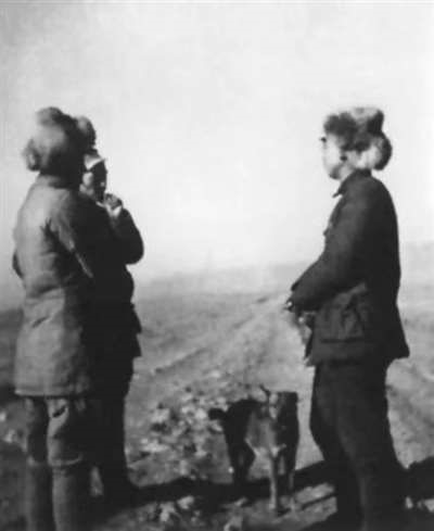 ◆1948年2月,许光达(右)等在宜川、瓦子街战役时,在前沿阵地察看地形。