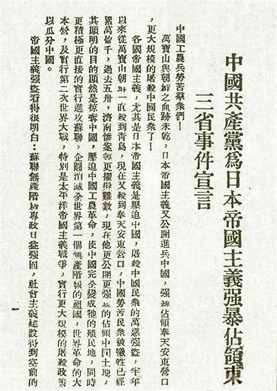 在“九一九宣言”发布后第二天(9月20日),中共中央发布了《中国共产党为日本帝国主义强暴占领东三省事件宣言》(部分)。