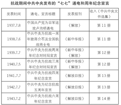 1937年7月7日卢沟桥事变后,日军开始全面侵华。7月8日,中共中央立即发表《为日军进攻卢沟桥通电》。从1938年到1943年,中共中央连续6年发表纪念“七七”抗战周年的公开电和宣言。这些宣言都是经过中共中央讨论后,首先在新华社广播,然后在《新中华报》《解放》《解放日报》上发表的,表明了中国共产党对当前时局的基本政治主张。中共中央的7个抗战通电和纪念宣言,宗旨是“代表中国共产党对全国人民说话”。它们在客观分析各个时期国际国内形势的基础上,重点阐发了中共对时局的看法和在抗战建国问题上的政策主张,真实表达了全国人民的愿望和要求。它们随着抗战局势的发展、国内外政治形势的变化、敌我友关系的变动等诸因素适时调整,日趋成熟。