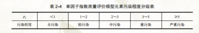 式中,Pi 为污染物 i 的环境质量指数;Ci 为污染物 i 的实测浓度(微克/克);Si 为污染物 i 的评价标准(微克/克)。根据式(2-4)计算出的污染指数对元素污染程度进行分级,见表 2-4。