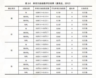 铜、锌、铅、铬 4 种重金属在不同施肥处理下评价结果见表 2-5。可以看出,铜、锌、铅、铬 4 种重金属不同处理的单指数均小于 1,说明短时间内不同施肥处理对土壤重金属含量影响不大,不会对铜、锌、铅、铬在土壤中的积累产生明显影响;从单项污染指数范围可以看出,NPK 处理对锌、铅、铬的影响程度明显大于其他 3 个处理(唐海龙,2012)。