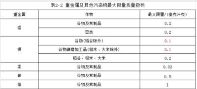 重金属一旦随粮食进入人体,就会在体内蓄积,还可转变成高度毒性的化合物,引起人们神经系统受损、智力下降、骨质疏松,甚至细胞癌变(Olawoyin et al.,2012;Xiao et al.,2015;李明姝 等,2018)。因此,必须控制重金属含量,一旦发生重金属超标,应退出口粮行列。《食品安全国家标准 食品中污染物限量》(GB 2762—2017)中,明确规定了食品中铅、镉、汞、砷、铬等重金属污染物的限量指标,其中包括谷物及其制品,详见表 2-2。
