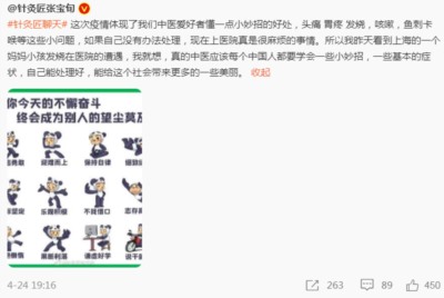 一直在微博分享中医小妙招的张宝旬老师在看到上海有病人退烧找不到医院时,便感慨:在疫*情下多学点中医的小方法可能可以解决大问题,毕竟医院在现在的疫*情下有很多不方便。
