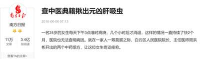 南方日报2016年还有过一篇报道,讲的是一名女孩每天莫名发烧,辗转多家医院都没找到病因、也没治好。后来是白云区人民医院院长根据中医典籍、第一次开出中药的反馈及病人最新反馈的过往饮食综合得出这是寄生虫病,然后继续调整组方,同时建议到诊治寄生虫病更权威的中山一院检查,最终发现是肝吸虫病,之后女孩继续服用周医生开出的中药,直至痊愈。