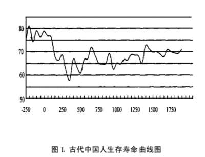另一个佐证,《古代中国人寿命与人均粮食占有量》一文中选取了秦汉到明清两千余年五千余人的生存寿命资料,这些人均来自正史、地方志、族谱等文献资料,且系正常死亡有明确的生卒年月(剔除神话色彩较重的人物),最终得出下图,这也反映了“人生七十古来稀”的描述是准确的。
