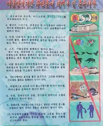朝鲜安全部与保卫部联合下发《紧急防疫期间居民遵守事项》,并制作成图片的形式张贴发放在各地: