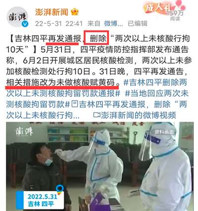 在一片舆论浪潮的声讨之中,吉林四平再发通报,删除“两次以上未核酸行拘10天”。31日晚,四平再发通告,相关措施改为未做核酸赋黄码。
