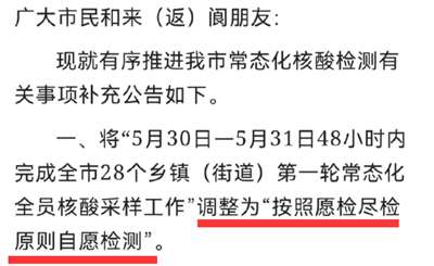 调整为“按照愿检尽检原则自愿检测”。
