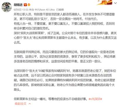 在胡锡进先生的微博中,他这样写到,“所有公职人员、特别是干部官员的家人都须低调做人,在外发生争执不可摆谱撒泼,更不可胡乱显示“实力”,否则一定会搞出一地鸡毛,付出代价”,“当深圳那个‘官太太’‘我家有50辆宾利’时,她基本就是把老公毁了”。