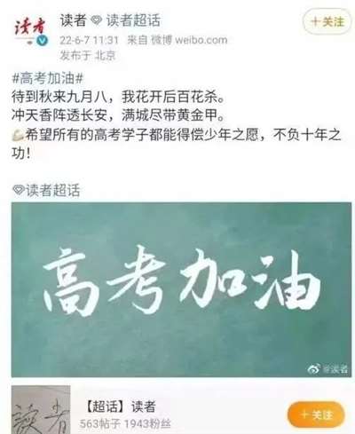 昨天上午11时31分,在2022年首场高考结束之时,《读者》官微发了个帖子,引用了一首诗“待到秋来九月八,我花开后百花杀。冲天香阵透长安,满城尽带黄金甲。”,最后还称“希望所有的高考学子都能得偿少年之愿,不负十年年之功。”