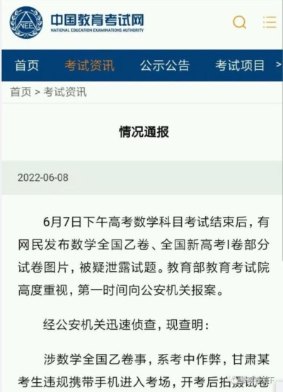 数学高考题泄漏?教育部:是作弊!
