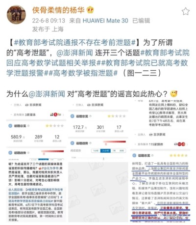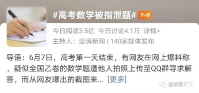 就在公安机关调查结果出来、教育部作出正式回应后,网上关于数学高考题外泄的报道及评论依然层出不穷,某媒体的#高考数学被指泄题#的话题依然火爆。有网友提出质疑:为何对高考泄题的谣言如此热心?有网友回应:某湃新闻被指捏造事实恶意炒作。