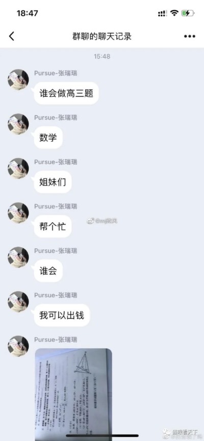 6月7日下午,有网友微博爆料称,有网友名叫“pure-张瑞瑞”在15时48分提问称:谁会做高三题数学,姐妹们,帮个忙,谁会,我可以出钱。他还在QQ群里附上四张疑似试卷的截图。有网友看到该图表示:真是高考题,一模一样。另有网友在该条微博下留言指出:这就是全国乙卷理科数学。另外有网友表示要报警。