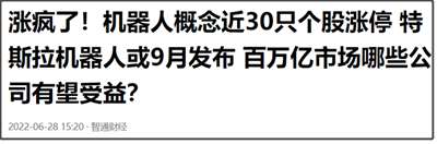 2022年6月21日,中文互联网上突然出现大量关于特斯拉机器人的视频,然后A股机器人板块开始连续大涨炒作。