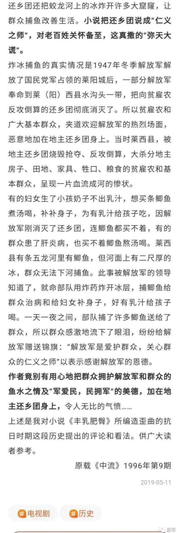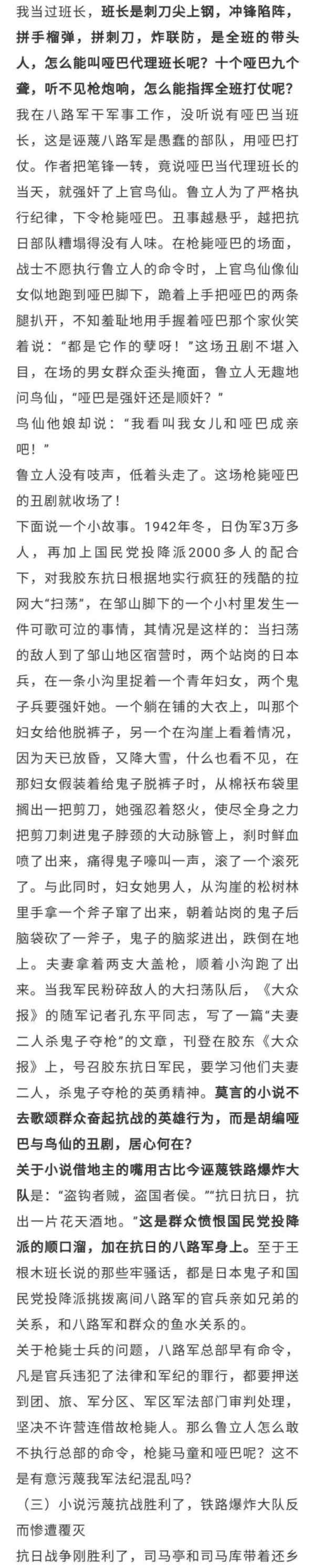 在莫言的《丰乳肥臀》里,把一个复员的志愿军英模妖魔化为战场负伤导致性无能从而专门折磨女性的性虐待,实属突破了人类良知底线的下流龌龊,只能解释为只有猥琐反动的人,对抗美援朝历史持的极端敌视立场,才促使其把人民英雄描写的如此不堪。