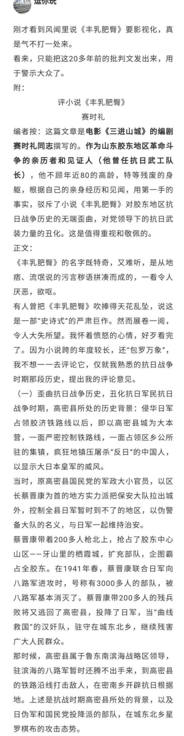 抛开司马南,抛开李敖,看看抗日老八路赛时礼将军1996年是怎么评价莫言的。赛时礼,1938年参加八路军在胶东半岛抗击日军,对高密的事很了解。莫言的《丰乳肥臀》里的事,人,赛时礼将军都很清楚。大家可以看看——