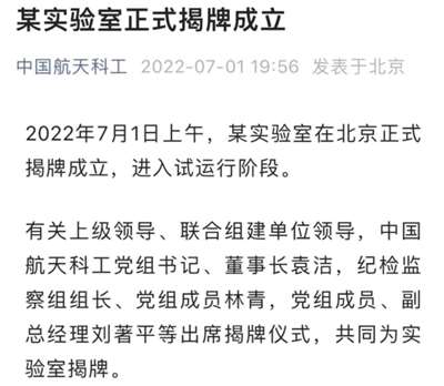 不仅要搞揭牌仪式,而且还要发布新闻,直言不讳的透露出航天科工集团的一个重要实验室有“有关上级领导、联合组建单位领导”参加。