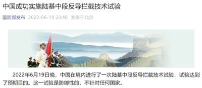 同样在19日深夜,中国国防部发布消息称,中国在境内实施了一次陆基中段反导拦截技术试验,试验效果符合预期。
