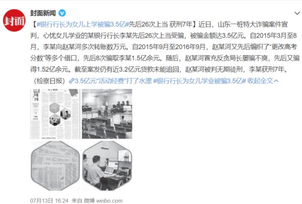 看完这个报道丞相的感想只有两个字,荒唐。骗子对行长说在学校有关系可以安排其女儿入学,然后骗了一大笔钱。之后又说要打通教育部关系,又骗了一大笔钱。就这样前后一共骗了3.5亿。
