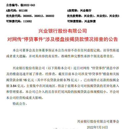 兴业银行发布公告,目前涉及停贷事件的楼盘房贷余额16亿元,已出现停止还款的金额为3.84亿元。