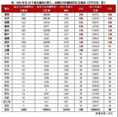 2021年末,克尔瑞曾经统计了24个重点城市延期交付项目占2021年销售比重,最高的为郑州,占比29%,最低的为淮安,占比1%,平均值约10%。