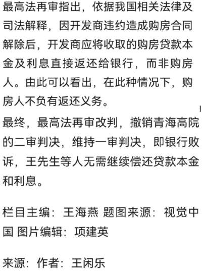 中国最高法院已经做出了最终裁决,让烂尾楼业主继续还贷显失公平,权利和义务失衡,因此银行败诉。