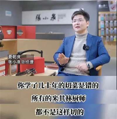 另一段视频采访,张小泉总经理夏乾良表示:“你学了几十年的切菜是错的,所有的米其林厨师都不是这样切的……中国人的菜刀都是这么方方正正的,我们把前面那个头变成这样,就斜过来,那时候国内没有这样的刀,那不是设计感,那是消费者教育。”夏乾良在讲这一段的时候,看视频你会发现,他全身抑制不住地自豪和优越感。我查了一下,夏乾良,复旦大学法学学士,曾经出版《大学生总裁---复旦儒商夏乾良的财富传奇》。