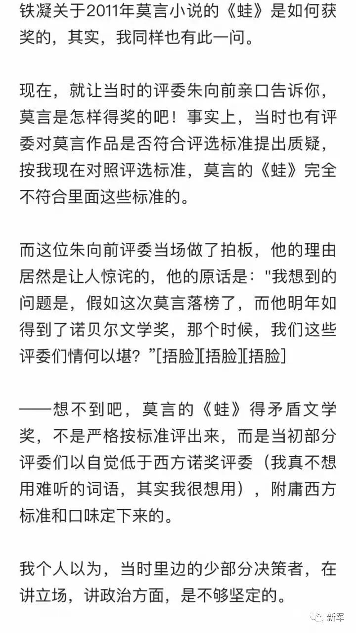 今天,当某些人把莫言之流奉为神明视若至宝时,当老战士老革命老同志批判人民作家的堕落和背叛时,我只想真诚地请教一下莫言同志:身为体制内的人民作家,你为中华民族提供了什么滋养,为世界文明贡献了怎样的华章?我们建议把瑞典文学院给你的颁奖词,全文公开在G明日报和R民日报上发表,接受人民大众的问讯和评判——