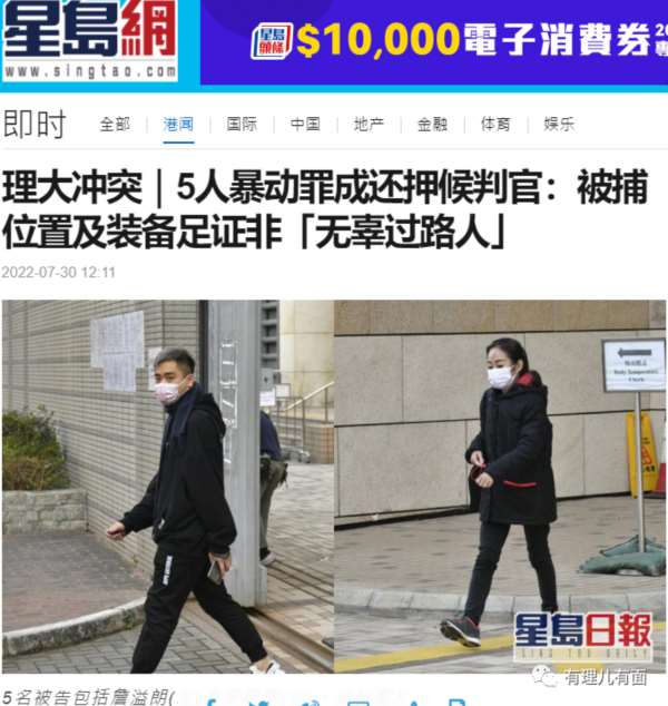 据《星岛日报》披露,2019年11月理工大学连日爆发骚乱活动,港警方包围理大,有乱港分子到油尖旺一带声援校内被困者。5男女涉于尖沙咀参与暴动,其中25岁女推销员开审前认罪,另外4人不认罪,经审讯后,在30日的庭审上被区域法院裁定暴动罪成,担保撤销,还押至8月6日求情及判刑!