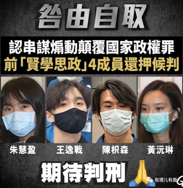 据港媒香港东网当天的报道,已解散的港毒学生组织“贤学思政”4名成员,包括王逸战、陈枳森、朱慧盈、黄沅琳,被控串谋煽动他人实施颠覆国家政权罪,4人当天在区域法院承认控罪,还押至9月24日进行求情及判刑。