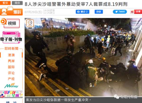 7月29日下午14时许,港媒东网以“8人涉尖沙咀警署外暴动受审 7人裁罪成8.19判刑”为题,报道了2019年8月11日乱港分子在尖沙咀警署外的弥敦道一带非法集结,以及向警署投掷汽油弹等攻击物,致使一名在警署内的警员下肢烧伤案件的最新庭审情况: