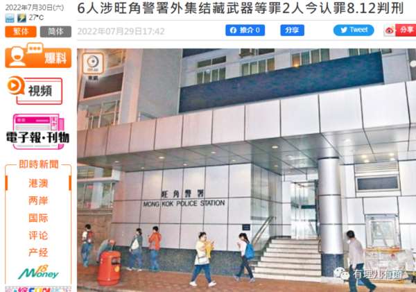 所谓,好事成双,喜报频传。同一天下午17时许,香港东网再次以“6人涉旺角警署外集结藏武器等罪 2人今认罪8.12判刑”为题,报道了2019年9月29日港岛一带乱港暴徒非法集结,并攻击旺角警署案件的庭审情况: