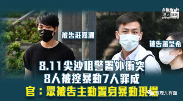 这7个人被裁定暴动罪成立的曱甴分别是:15岁男童X、廖伟明(25岁)、庄嘉灏(24岁)、黄千溥(21岁)、罗后成(19岁) 、潘冠雄(26岁)及罗汉铭(22岁)!此外,22岁的罗汉铭还被控一项无牌藏有弹药罪!