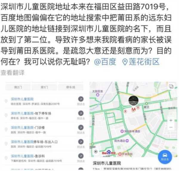 微博有一位网友叫深圳胖胖熊,为深圳儿童医院医务科副主任,他直接发文控诉在百度地图搜索深圳市儿童医院,搜索结果却将莆田系的远东妇儿医院的地址链接到了下面,而且放到第二位,导致许多看病的家长被误导到莆田系医院。