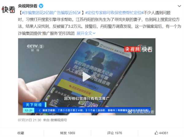 然而,然而,晚上央视财经频道又报道了一个诈骗团伙,由于家属失联被拐卖等家人心急如焚,当他们在某搜索引擎搜索时便被引入了一个诈骗公司。